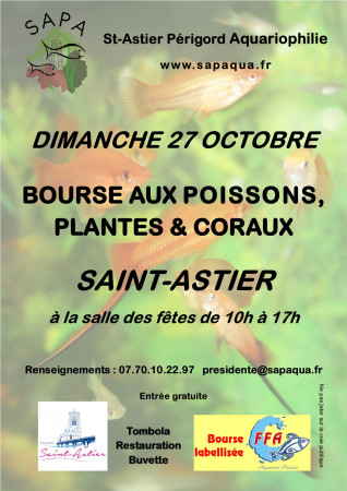 Bourse aquariophile eau froide, eau douce, plantes et coraux à la salle des fêtes de St Astier le 27 octobre 2019, organisée par le SAPA (St Astier Périgord Aquariophilie)
