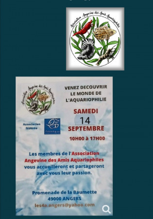 Le 14 septembre 2024, à Angers, l'Association Angevine des Amis Aquariophiles vous ouvre ses portes, venez decouvrir le monde de l'aquariophilie.