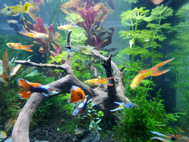 j'ai 2 et bientôt 3 aquariums : 1 de 60l environ en aquascaping (agencé avec amour avec de belles plantes et racines naturelles) accueille une petite communauté de mâles endler qui cohabitent actuellement avec 5 mâles guppy, qq crevettes et qq escargots