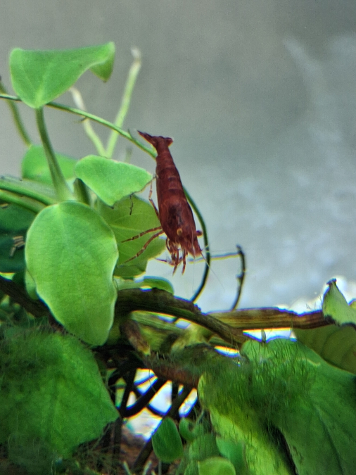 J'ai remarqué qu'il manquais une crevettes dans un de mes aquariums , et voila je l'ai retrouvé à Rosas en Espagne sur un rond point et en plus elle pose .
