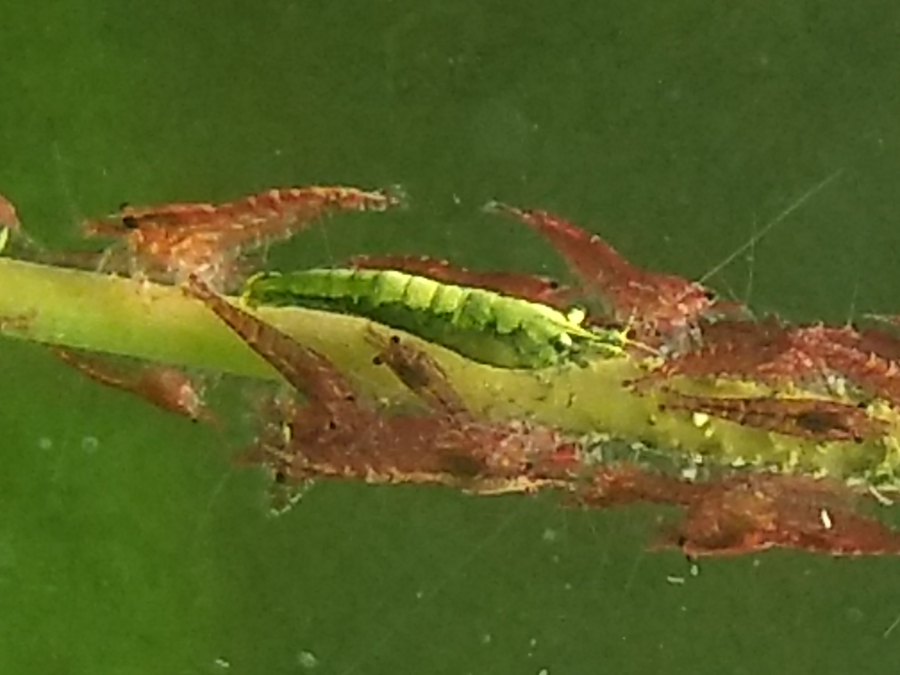 J'ai un souci avec mes crevettes jaunes, j'ai acheté il y a deux semaine des crevettes jaunes et (je pensais à des yellow Fire, mais au magasin d'animalerie on m'a dit que c'était des neocaridina davidi orange) au jour d'aujourd'hui elles sont presque devenu vert/transparent et il ne leur reste que le dessus de jaune. Savez-vous d'où cela peut venir ? Elle sont toute pareil sauf mes red cherry. Les paramètre mon l'air bon, j'ai 6 de pH, pas de nitrate ni de nitrite, un kH de 4 et un GH de 6. Désolé pour la qualité de la photo, mais pas facile de prendre une crevette si petite de prêt.