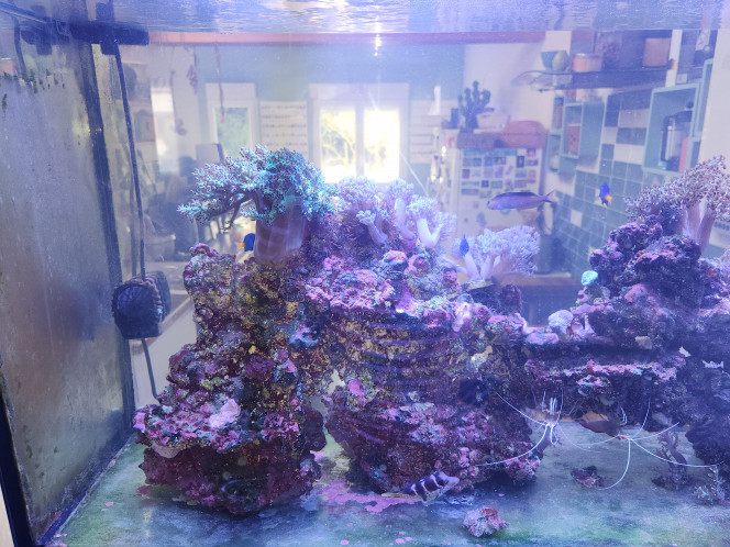 une expérience malheureuse en eau douce, aquarium changé en eau de mer sans sable ni gravier, avec écumeur. Est logé dans le cadre d'une ancienne fenêtre, environ 150 litres