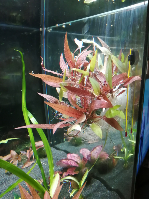 Changement du gravier claire(du Scalare, soit disant sombre) pour du sable noir. Ajout d'Anubias hastifolia, Crypto affinis dark orange et de gigantea(enfin celles qui ont survécu au transport). J'avais que du lotus rouge, du crinum natans et de la Cérato dans le bac depuis 2 mois, j'ai introduit les nouvelles plantes hier, 2 heures après l'eau est devenu laiteuse, j'ai mesuré un gros pique No2, je devais avoir 3 bactéries qui se battaient dans le filtre pour manger. Ce matin tout va mieux, même si le 3/4 des feuilles des lotus ont fondu en l'espace de quelques heures. Elles prennent une couleur argenté, se disloques, et disparaisses. Je vais ajouter 30-40L d'eau et je vais laisser faire jusqu'au printemps pour voir ce que ca donne comparé à ce que j'espère, puis je verrais pour la faune. Ps: J'ai pas pu m'empêcher d'ajouter une pastille pour les clandestins.