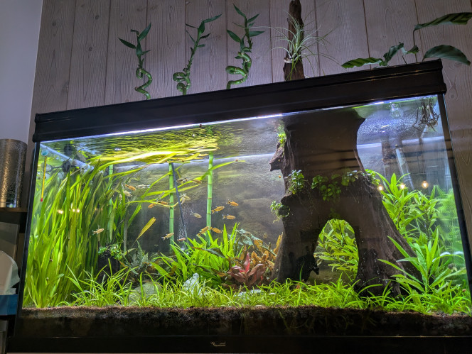 Je vous présente mon aquarium. Je ne suis pas complétement convaincue de l'esthétique, je le trouve un peu "grossier" Avez vous des suggestions d'amélioration svp ? 😊