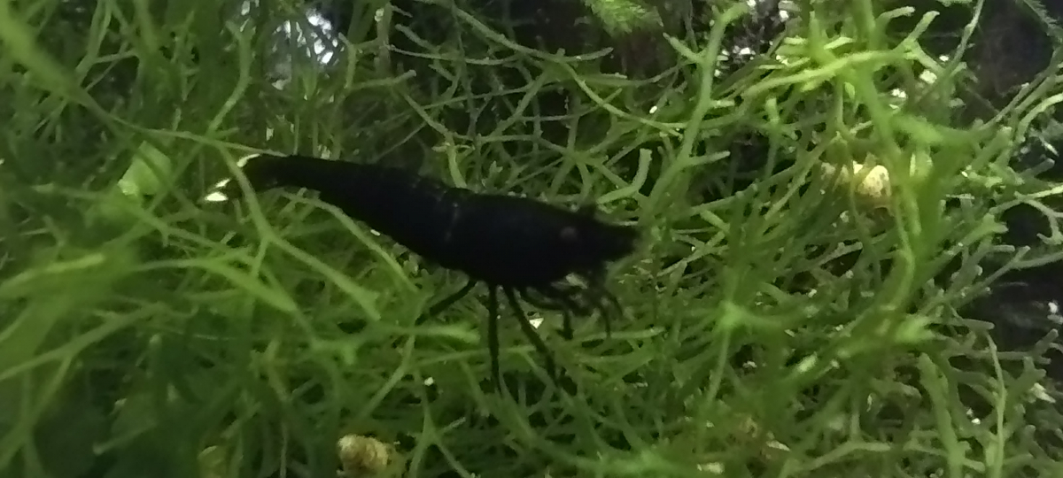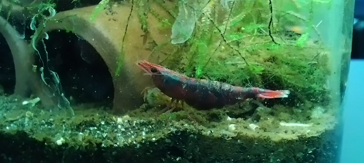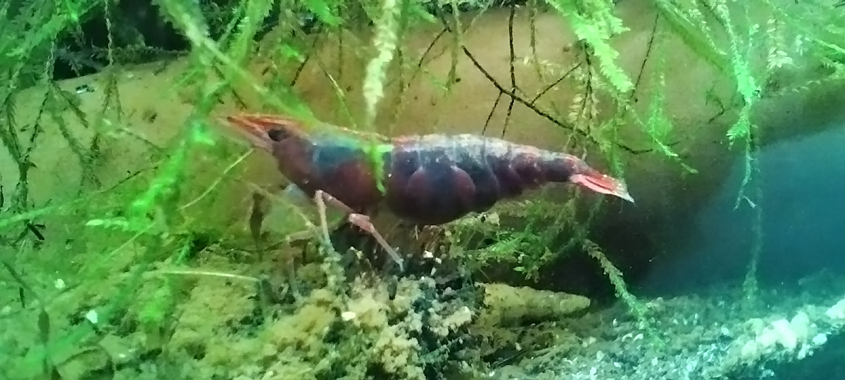 Cette femelle particulièrement colore, je l'ai pêché ce weekend dans le 180 où il subsiste encore quelques Neocaridina davidi rouge de la souche d'origine. Quand j'ai vu sa robe, j'ai été stupéfait. Je l'ai mise dans le 30 litres avec ses copines pour qu'elle vive sa meilleure vie, et voir ce que cela donnera en terme d'influence sur la coloration de la colonie à moyen terme.