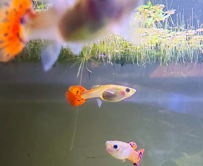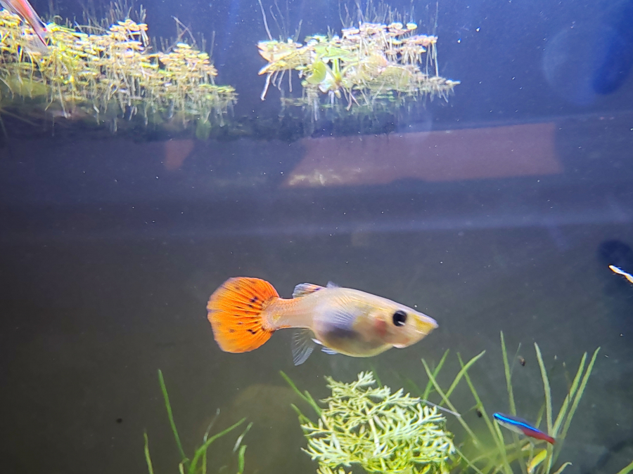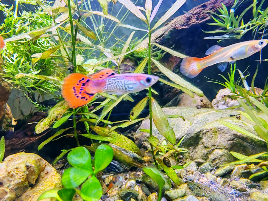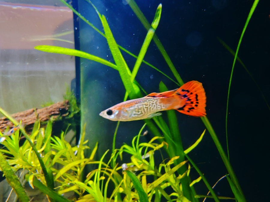 Sauriez-vous me dire pourquoi ce guppy est différent des autres? Les dessins sur son corps différents des autres, sa nageoire arrière plus grande que les autres et la tache rouge au niveau de la nageoire dorsale aussi que les autres n'ont pas.