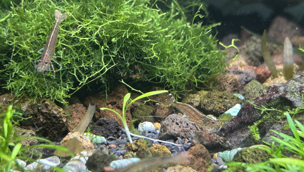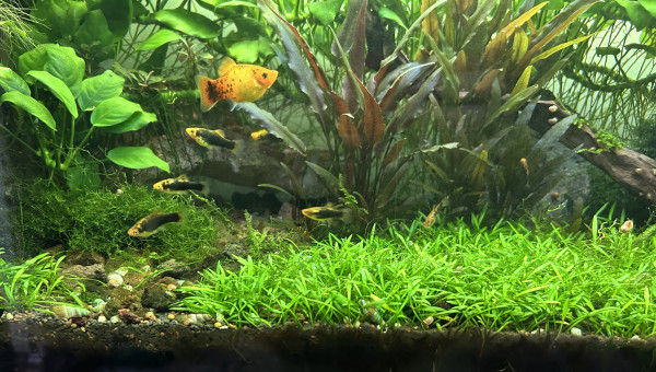 Il sert maintenant à la reproduction de platys, les autres habitants sont un couple de Chuna Gold des neocaridinas japonica