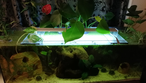 Pour le moment mon eau est trop dure pour y mettre des poissons Il y a des crevettes blue velvet des neritinas des planorbes et autres cousins