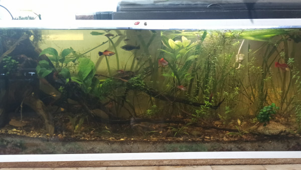 Après un long moment j'ai enfin trouvé une meilleure source de lumière ( chiros, a2, 80 cm) elle est plus courte que le bac mais je voulais garder une zone plus ombragé les racines, j'en ai profité pour réduire la population de xipho et ajouter une bredding box de trois litres dans la quelle j'ai isolé deux femelles neocaridina grainées. Je voulais améliorer la lumière depuis longtemps mais c'est vos retours qui m'ont motivé a passer le cap. Merci !
