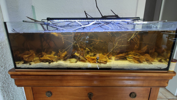 Bac de 150L en cyclage. Première introduction de poissons prévue environ fin octobre. Je vais commencer par quelques Khulii, quelques jours après, rajouter encore quelques Khulii et finalement, après encore un peu d'attente, je mettrai mon couple de Betta Smaragdina. Bois et feuilles de ma forêt. Lowtech