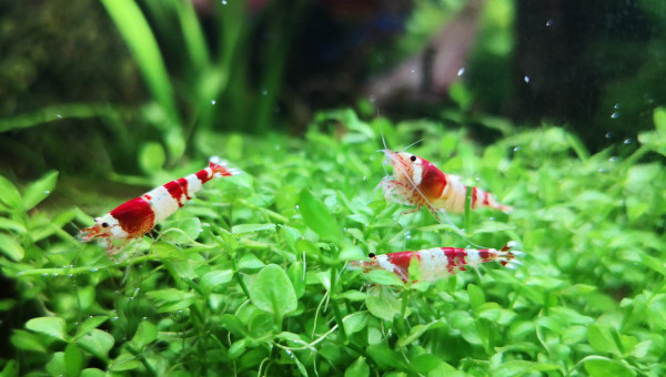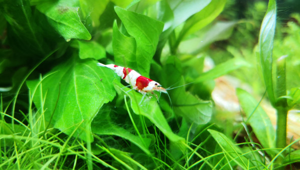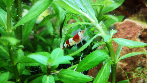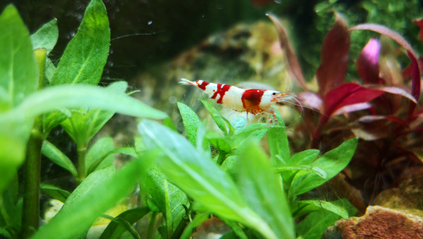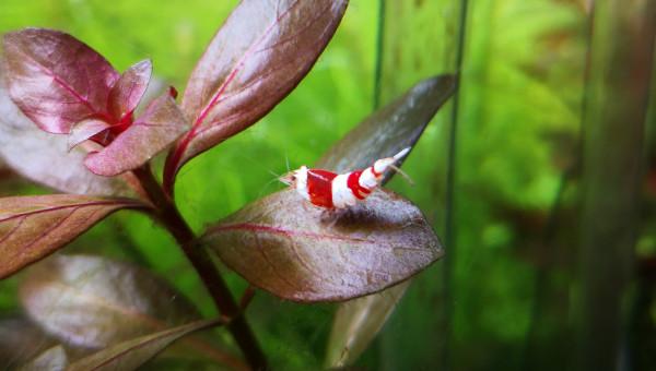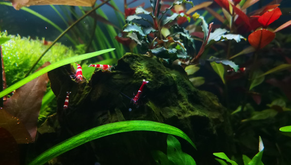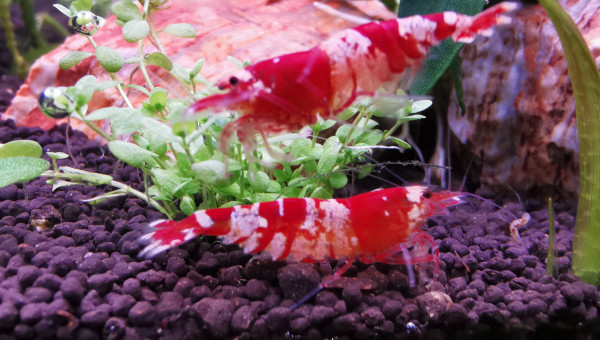 Et voici une très jolie mutation apparue dans mon bac au fil des reproduction :) de couleur bordeaux beaucoup plus sombre que le rouge de CRS classique avec de petites taches blanches sur la tête et les épaules ainsi que sur la queue. Elle s'est reproduit et j'ai 3 spécimens dans mon bac, les 2 autres non quasiment plus que les taches sur la queue.