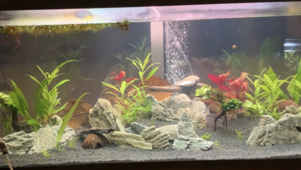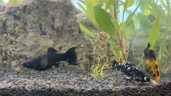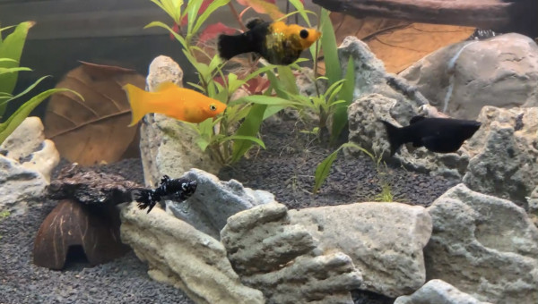4 femelle mollys Golden lyre Golden dust Black lyre Dalmatien noir tache blanche 1 mâle molly Golden lyre Des pierres que j’ai trouvé sur la plage