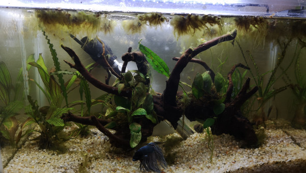 Gros problème avec ce bac. Refait en février. Depuis j'ai de la ciano (?) , d'où les 3 otocinclus. Les Boraras était à une amie qui a cassé son bac. Pour le moment la cohabitation se passe bien.. Deux trois Planorbes et deux neritina dedans.