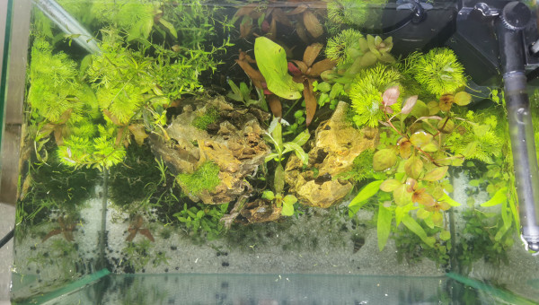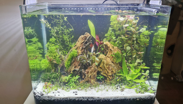 Aquarium de sdb. Dennerle Scaper's soil. Pas de co2. Eau de robinet et Mont Roucous. Population non décidé encore.