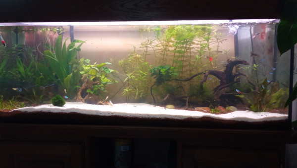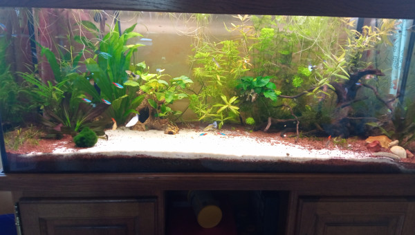 Aquarium dans lequel sera mise la population de l'aquarium guppy ainsi que les plantes présente dans ce même aquarium. En plus je souhaiterais qu'il y est 8 corydoras trilineatus, un couple ou trio de apistogramma cacacuoide et sois 15 néon.