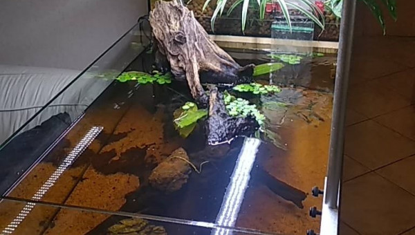 Aquarium Biotope amazonien avec filtration en aquaponie. 2 bacs en cascade, remplis de plantes terrestres, alimentés depuis le bac principal se déversent dans le grand bac
