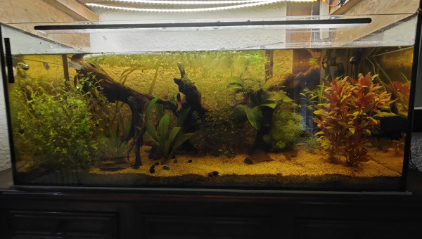 Biotope inspiré de zones asiatiques. J'ai comme population, 3 gouramis perlé, 1 ancistrus, 6 japonica, quelques néo sp orange et 2 neritina zebré.