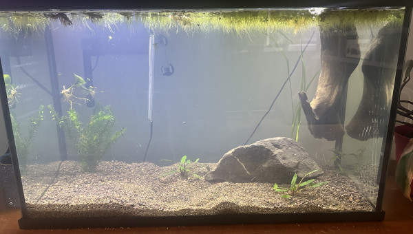 Installation substrat roche aquarium remplit et démarrage du filtreur. Ajout d’un peu de nourriture de poisson ? pour commencer la mise en route
