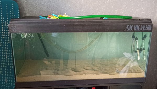 Arrivée de 6 Acaras bleus. Le bac était vide de vivant à part quelques crevettes arrivées là lors de transfert de plantes (zoés) et qui prospèrent très bien. Le bac étant victime d'algues récurrentes, la majorité des plantes et de la déco a été retirée. Une petite vingtaine de plantes est commandée et le bac va être très prochainement refait. Pour le moment, il n'y reste que quelques Rotala, 1 Cryptocoryne Lucens et 2 touffes de Bolbitis Heudelotti et une grosse racine qui sert de cachette.