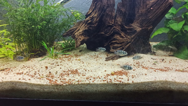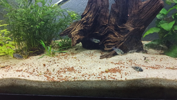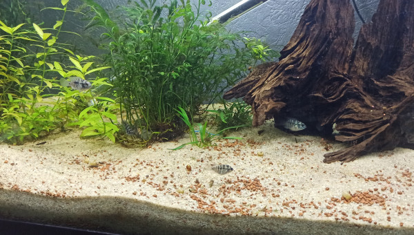 Les 8 jeunes Acaras grandissent très bien malgré quelques disparités concernant la taille de chacun (du simple au double). Ils ont maintenant 4 mois et mesurent entre 2.5 et 4 cm et ce sont de véritables gouffres en ce qui concerne la nourriture. - Paillettes - Granules cichlidés - Pastilles de fond carnées et végétales - Artémias congelées
