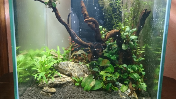 Contrainte : lumière moyenne (base). N'est pas très aquariophile => doit nécéssiter peu d'entretien/taille ! Très planté pour pouvoir quasi s'auto-entretenir => croissance lente requise