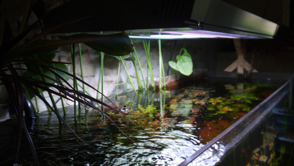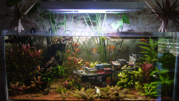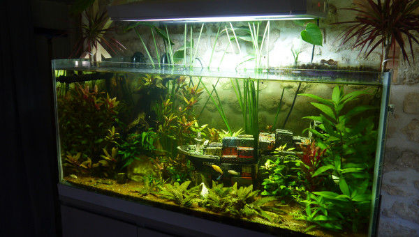bac 350L acheter d occasion avec meuble. j ai enlever l encadrement en plastique. j' ai remplacé la vitre de devant. mise en eau décembre 2019. j ai déménager les poissons douce de mes autres bacs dans celui là.