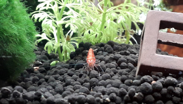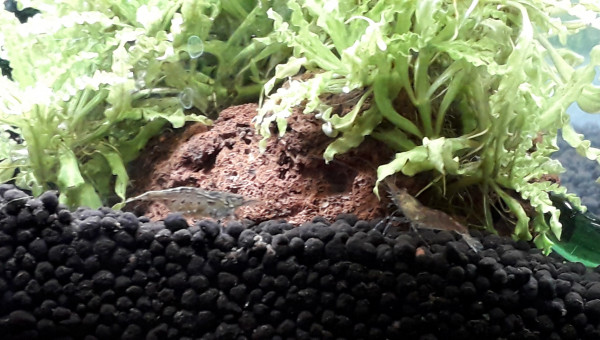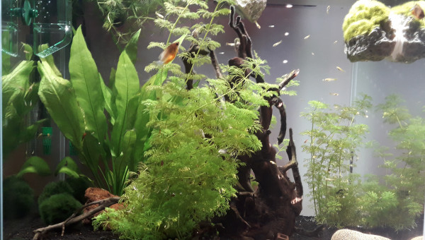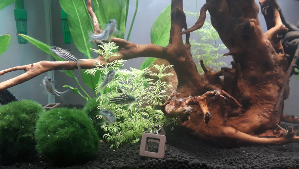 Fond : Crevette + Corydoras nanus Surface : guppy endler
