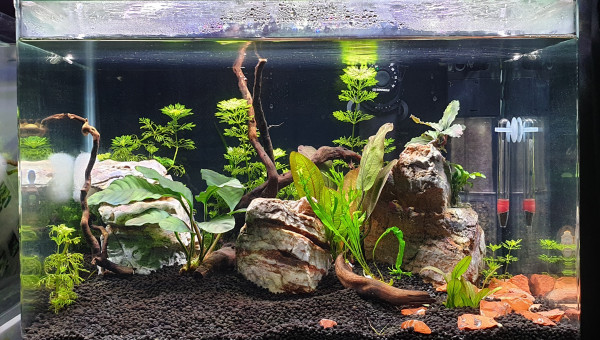 Aquarium Nano Aquascaping : Crevettes et quelques poissons Après un démarrage raté - mort des poissons - une relance du bac avec changement complet de l'eau mais maintien du filtre et de ses bactéries. Test concluant avec 5 guppys et introduction de nouveaux poissons.
