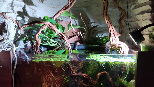 Biotope du Rio Carahuayte, petit affluent de la rivière Ucayali dans lequel l'Apisto Nijsseni est endémique. Créé sur mesure dans une petite alcôve. Les plantes hors d'eau correspondent aussi au biotope, dont des hydrocotyles terrestres, des bromeliacées et des peper sp. peru.