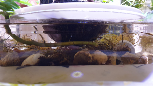 Mon premier bac d'expérimentation. Mise en eau la mi-juin 2019. Pas de changement d'eau depuis. Je laisse ce bac agir naturellement. Je fais en sorte d'avoir le moins de contact. J'observe simplement son évolution. La petite touffe d'herbe est là depuis plus d'un mois et ces racines se portent à merveille. Il y a trois jours j'ai mis une bouture de papate douce qui commence à montrer ces racines.