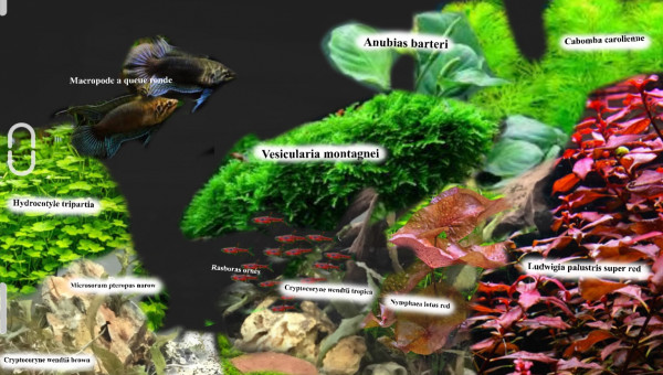 Aquarium d’eau noir. Population: une dizaine de gourami chocolat et j’hesite A y faire cohabiter deux gouramis samouraïs et des crevettes bien rouges pour ressortir dans le noir de l’eau.