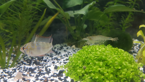 mon aquarium 50l avec un couple de Ramirezi, un couple de Trichogaster leerii, 1 corydoras, 5 néons rouges (cardinalis), 3 crevettes caridina multidentata et 3 crevettes red cherry