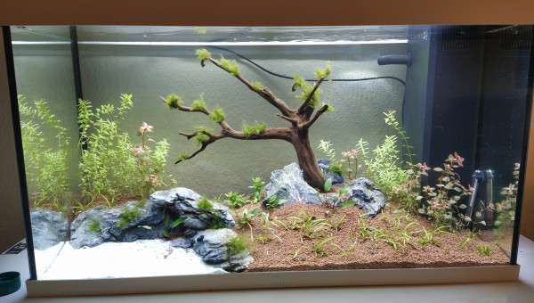 Les faux néons se sont bien habitués, mangent normalement et occupent tout l'espace de l'aquarium . Les crevettes ont bien grandi (déjà!) Les plantes n'ont plus si fière allure, ajout d'engrais. Apparition des algues pinceaux à quelques endroits... Penser à ajouter des plantes à croissance rapide et tester à nouveau l'eau pour l'équilibre phosphates-nitrates.