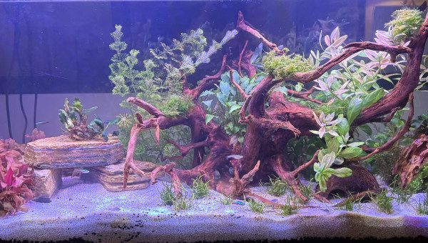 - Lilaeopsis brasiliensis x2: pelouse - devant milieu et droite - Alternanthera reineckii ´purple ´ x2: devant et groupés - côté gauche - Rotala rotundifolia ´blood red’: au milieu - fond à droite - Taxiphyllum barbieri: mousse - Proserpinaca palustris - entre pierre gauche et racine - anubia nana kirin - sur pierre - Schismatoglottis prietoi - sur racine - Anubia heterophylla - noix de coco - Anubia nana bonsaï - roche droite - Glossostigma - graine pierre droite