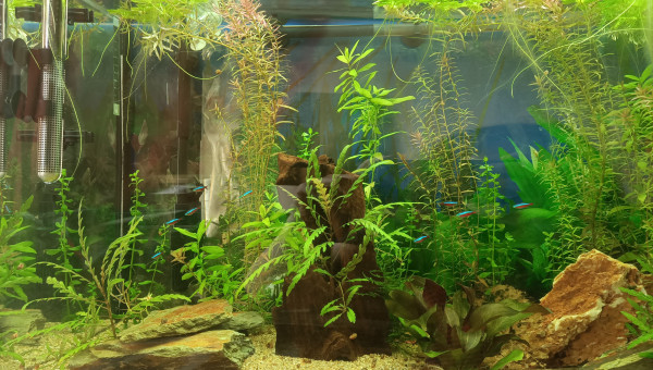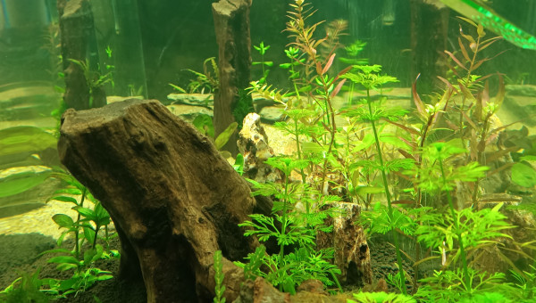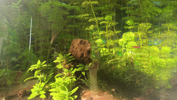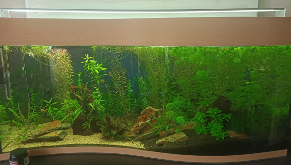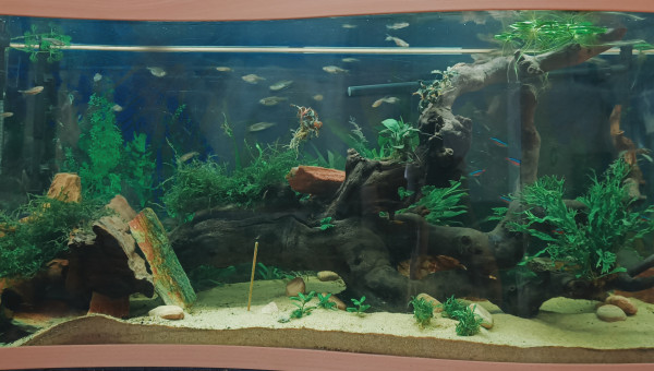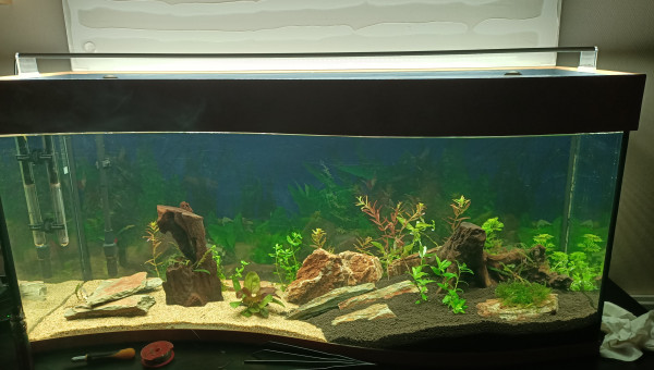 J'ai refais l'intégralité de l'aquarium, changé le substrat, ajouté enfin mon énorme racine/tronc de vigne, replanté, etc Mon substrat baissait systématiquement mon pH à 4.5, impossible de le remonter et mes danio ne le vivaient pas super bien. Et l'absence de cachettes suffisantes fait que je ne voyais jamais l'ancistrus ailleurs que collé sous la même pierre. Maintenant je le vois se déplacer même en journée, et les cardinalis aussi semblent préférer et exploitent enfin les 120cm de façade, il était temps !