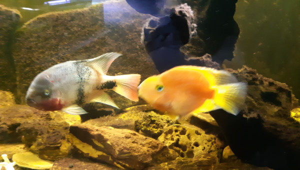 Le red parrot est le nom vernaculaire d'un poisson hybride,généralement stérile,entre deux espèces de cichlidés d’Amérique latine: mâle amphilophus citrinellus x femelle paraneetroplus synspilus. le poisson a été crée à Taïwan de 1986,un peu avant le flowerhorn. le red parrot,ou blood parrot cichlid ou bloody parrot en anglais, soit poisson perroquet rouge sanguin,présente des caractéristiques morphologiques uniques par rapport à ses géniteurs,en particulier la forme non-naturelle du corps. 1 poisson dans mon 600 litres