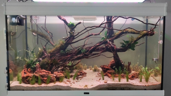 Installation du harscape roche et racine. Cette mise en eau à pour objectif le "trampage" des racines car elles sont très grosses. La mise en eau va aussi me servir de test pour les changements d'eau, la mise en œuvre du CO2 et la maintenance du filtre. Les changement d'eau se feront toutes les semaines avec 40 à 50 % d'eau remplacé.