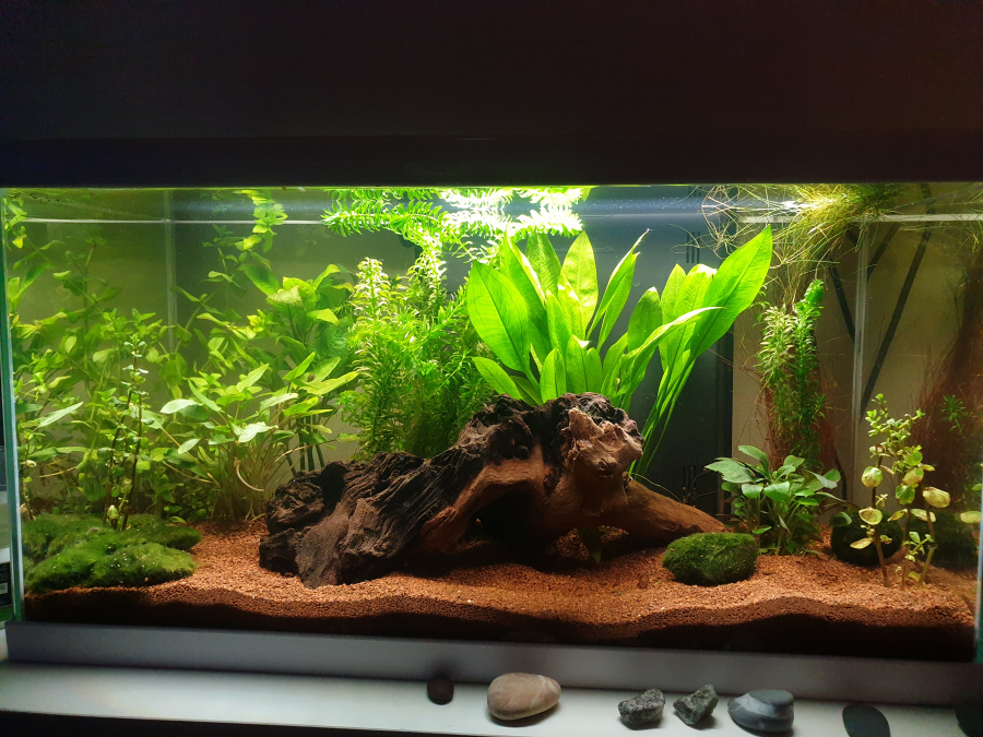 Aquarium autre en eau douce. Volume brut d’environ 60 L (60×30×33.5 cm). Volume net : 58 L. Mis en eau le 31 août 2021. Points notables : racines. Propriétaire basé à Saint-Étienne.