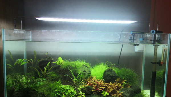 Bac où j'ai tenté un aquascape très planté avec des pierres Black Lava.