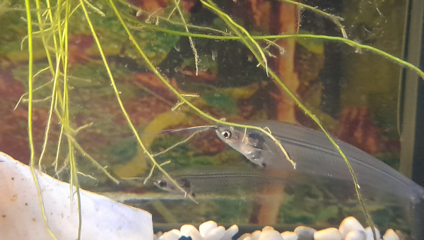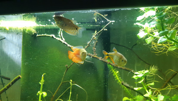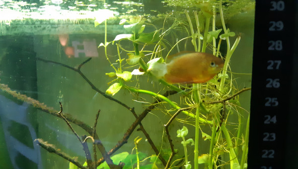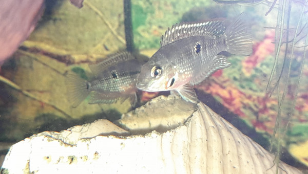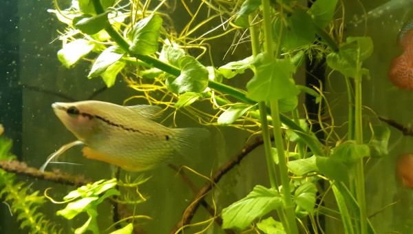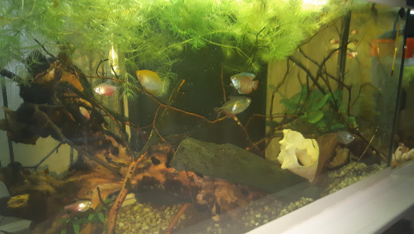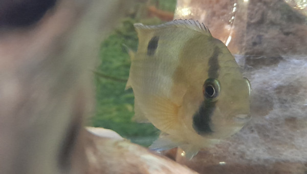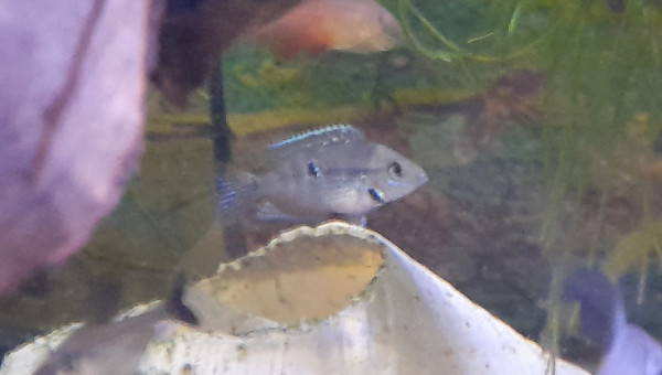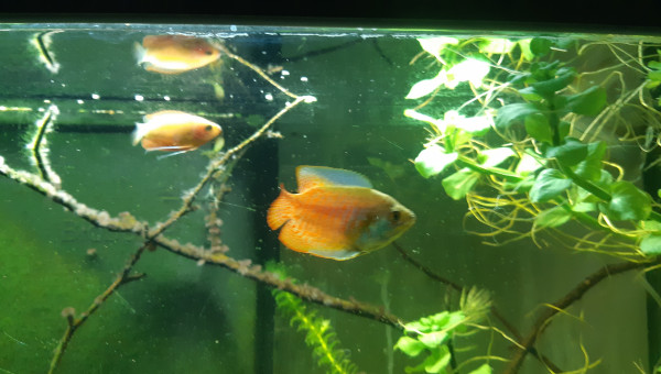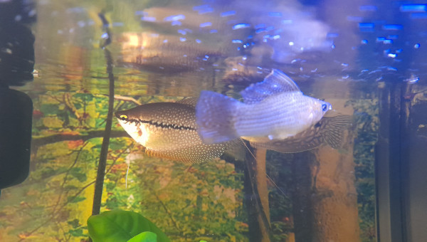 De nom scientifique, Trichogaster trichopterus. De nom commun, Gourami bleu ou Gourami trois tâches. Il fait parti de la famille des Anabantides. Il est originaire d'Asie du Sud-Est, d'Indonésie. Il mesure de 10 à 12 cm à l'âge adulte. Son corps est d'un bleu pâle avec des reflets bleutées plus foncées. La température de l'eau où il évolue est de 22°C à 28°C, avec une préférence à 25°C. Le Gourami bleu est un poisson d'eau douce qui préfère vivre en couple. C'est un poisson territorial. Le plus souvent, il nage lentement dans les endroits dégagés à l'arrière-plan de l'aquarium. Mais, il aime aussi se cacher dans les plantes. Lorsqu'il est en bonne santé, ses antennes sont souvent en mouvement. il a une préférence pour la lumière plutôt tamisée. Une fois adulte, il devient très agressif, n'acceptant pas facilement la présence d'espèces voisines, surtout dans les petits bacs. 2 dans mon aquarium de 95 litres