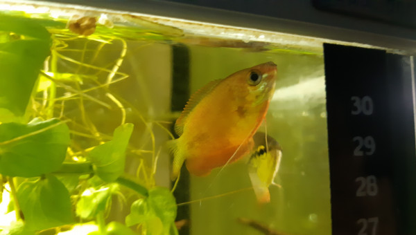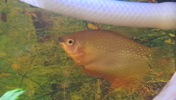 Le Trichopodus trichopterus est un poisson d'eau douce occupant le milieu et la surface de l'aquarium. Il mesure entre 12 et 15cm adulte. Cette espèce vit en couple ou en harem. Il est souhaitable de ne maintenir qu’un mâle dans un aquarium de moins de 200L. Son aquarium de 120L minimum avec une façade de 120cm minimum est composé d’une végétation dense et de plantes de surface. Il convient aux bacs communautaires avec des espèces calmes. Le Gourami doré est omnivore à tendance insectivore. Il apprécie particulièrement les proies vivantes. Nom latin : Trichopodus trichopterus Dureté de l'eau : douce à dure Forme : Corps ovale, plutôt trapu. La forme naturelle courante est gris-bleutée avec une tâche ronde au milieu du dos et une autre sur le pédoncule caudal. Origine géographique : Malaisie, Birmanie, Thaïlande, Viêt Nam Habitat naturel : Bras calmes des rivières, étangs et mares Nombre d'individus recommandés : En couple ou harem Taille de l'aquarium recommandé : Minimum 120L Zone de nage : Milieu et Surface Régime alimentaire : Omnivore, il apprécie particulièrement les vers, tubifex, vers de vase, … très tolérant quand à l'alimentation Genre : Trichopodus Espèce : trichopterus 2 dans mon aquarium de 95 litres