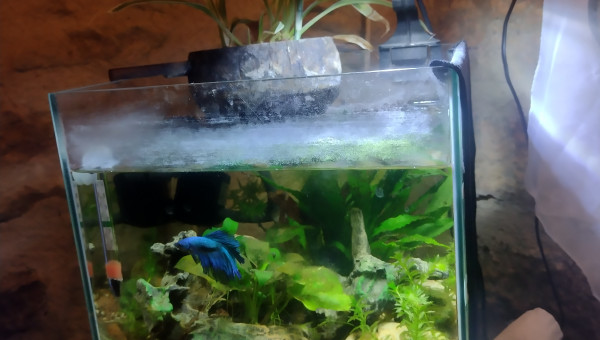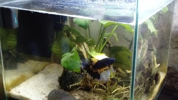 bac spécifique d'ornement composé d'un "future" couple de killies étoilés En d'écoration il y a une racine de mangrove avec des anubias dessus ainsi que des élodées et deux galets. En équipement il comprote une petite pompe de brassage (le courant est vite cassé ), un termomètre , un chauffage (peu allumé voir jamais), lumiere led (eclairage 7h)