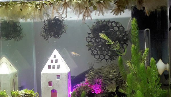 Actuellement problèmes : - pas ou peu de reproductions chez les crevettes ; les grainées se défont souvent de leurs œufs - mousses marrons à de nombreux endroits Les anubias et les ceratophyllum vont bien. Gros nettoyage de l'aquarium. Installation d'un bout de moustiquaire couvrant les 3/4 du bac en fibre de verre pour faire pousser quelques mousses au sol ; trous pour installer quelques plantes sensées être plus résistantes et moins gourmandes en co2.