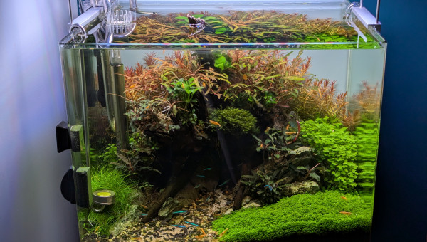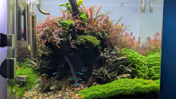 Revoici mon bac, juste avant une taille d'entretien... Tout pousse bien! Le rééquilibrage du fer à résolu les problèmes de croissance des plantes ?. Seul hic... J'ai réintroduit une bucephalandra de mon ancien bac qui paraissait parfaitement saine de toute algue pinceau (présentent dans mon scape précédent) et il y a 1 mois de cela , j'ai vu quelques poils apparaître sur cette plante que j'ai aussitôt retirer... Le mal était fait ?... Pour l'instant ça reste limité.. Un petit banc de 6 corydoras pygmaeus est venu completé la population ☺️
