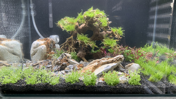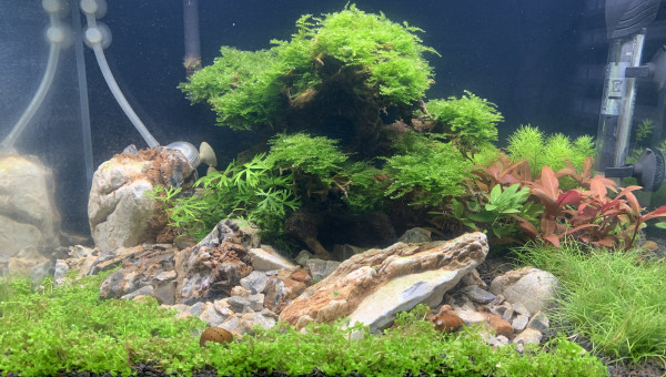 Introduction de 5 neocaridina red cherry, très gros entretien suite a une grosse poussé d’algues «  noires » et d’algues vertes 2 changements d’eau et changement de l’éclairage. Taille des plantes le bonsaï disparaît malheureusement sous la mousse.