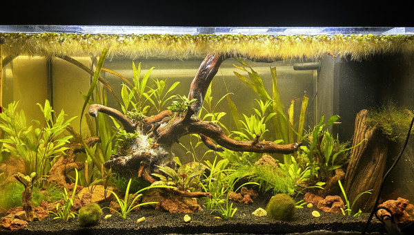 Novice en aquariophilie, je me lance dans le gros volume (125L brut) pour une meilleure stabilité des paramètres et franchement un paysage qui donne envie d’être regardé. Bien que je ne sois pas encore satisfaite de ma plantation. Une anubia barberi sur une racine va venir à gauche de la grosse racine et en suite, si vous avez des idées de plantes pas trop exigeantes, sans CO2, je suis preneuse. Je fertilise toutes les semaines au Ferropol . Les paramètres : Chauffée à 24 degrés Ph: 7 GH : 5 KH: 4 No2: 0 No3 : 0 Ce bac a été créé le 14 novembre 2022 et je viens d’intégrer des blues velvet et des asolene spixi qui s’y plaisent plutôt pas mal on dirait bien, les crevettes sont sans arrêt en mouvement et les asolene me font des pontes à profusion. Pas encore de grainées en vue chez les crevettes mais on espère encore . Je compte intégrer des rasboras galaxie puis des arlequins pour finir et c’est là que j’aimerais vos avis, par y mettre mon combattant . J’ai peur qu’il ai envie de tuer tout le monde … c’est un plakat koi plutôt tranquille tout seul dans son 25L actuellement .