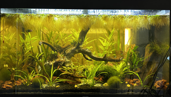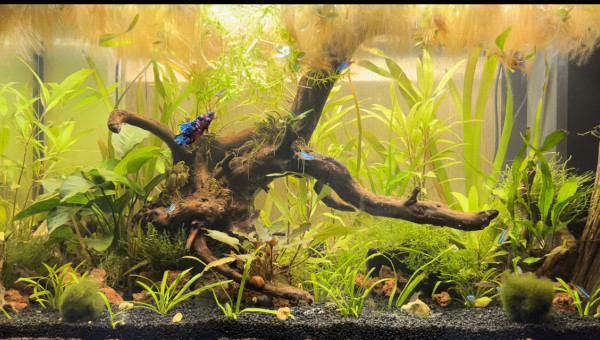 Tout le monde à rejoint avec succès le 125L qui, de toute évidence n’est plus très asiatique mais plutôt équatorial, les cambarellus grandissent bien, les crevettes sortent, le betta ignore tout le monde, les galaxy sont très actifs et les néons plutôt calme. Alors que j’aurais pensais l’inverse . Tout le monde cohabite à merveille eau chauffée à 24. Éclairage 10h/jour .