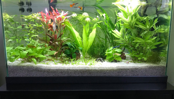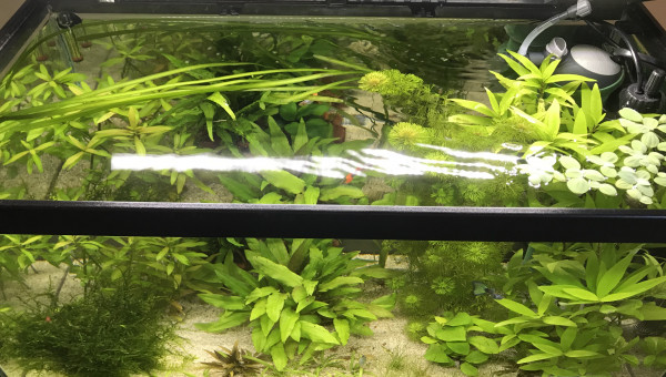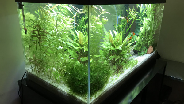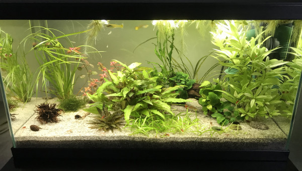 Guppys, crevettes red cherry et planorbes roses.