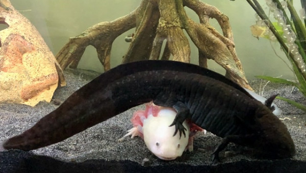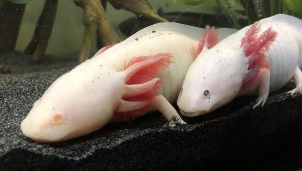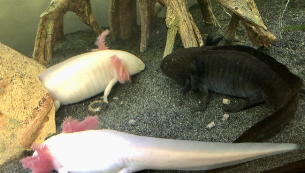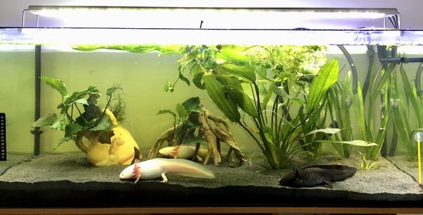 Petit 240l avec 3 beaux axolotls (1 mâle et 2 femelles) Le mâle âgé de 2 ans est noir et porte le nom de Réglisse. La femelle leucistique a 4 ans et se nomme Chamallow. La femelle albinos a 2 ans et se nomme Guimauve.