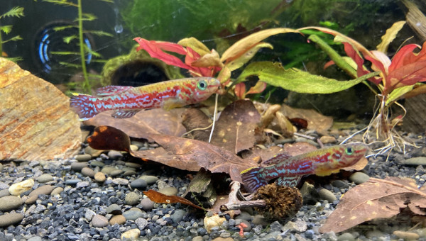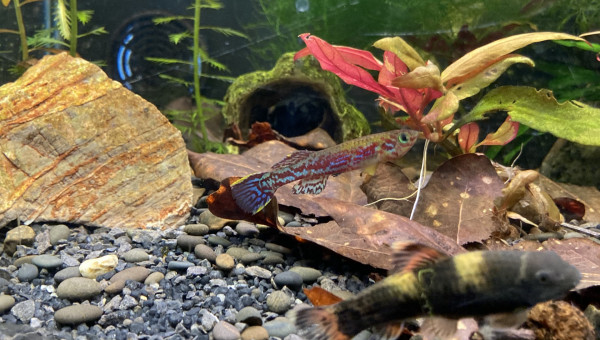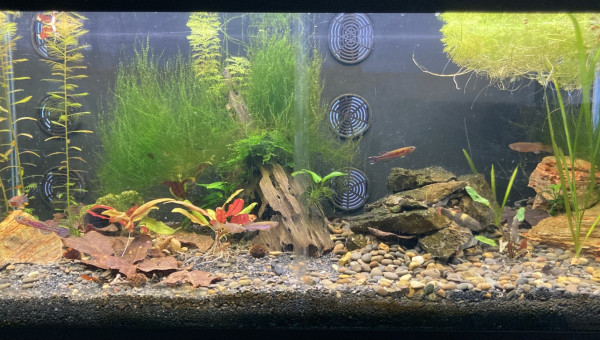 Couple parents 1 Cherax Pulcher et très jeunes + 3 aphyo (mirabilis - (1 femelle) gardineri) - protection grillagée au dessus (2 mâles retrouvés morts par terre)